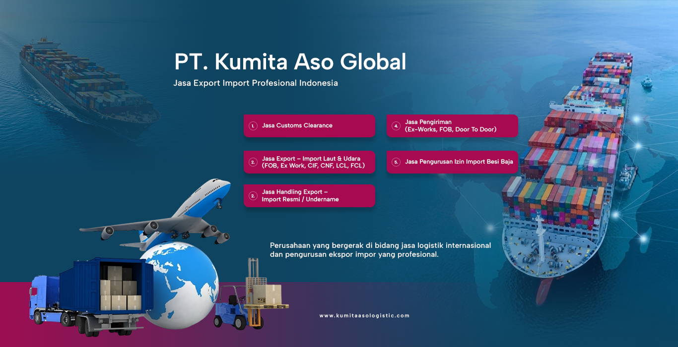 PT. Kumita Aso Global merupakan perusahaan yang bergerak di bidang jasa logistik internasional dan pengurusan ekspor impor yang profesional dan terpercaya. Kami hadir untuk membantu kebutuhan bisnis dalam pengiriman barang lintas negara dengan proses yang mudah, aman, dan efisien.